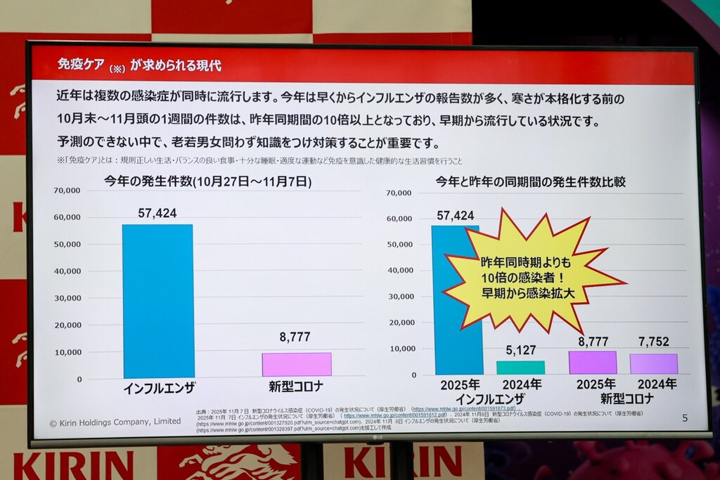オープニングイベントにて、桜井氏はインフルエンザの早期流行や複数の感染症の同時流行といった「感染症時代」の到来を背景に、免疫に関する正しい理解を促す展示会の必要性を説明。キリンは「食から医にわたる価値創造」を目指し、特にヘルスケア領域で免疫を最重点領域と位置づけていることを強調した。