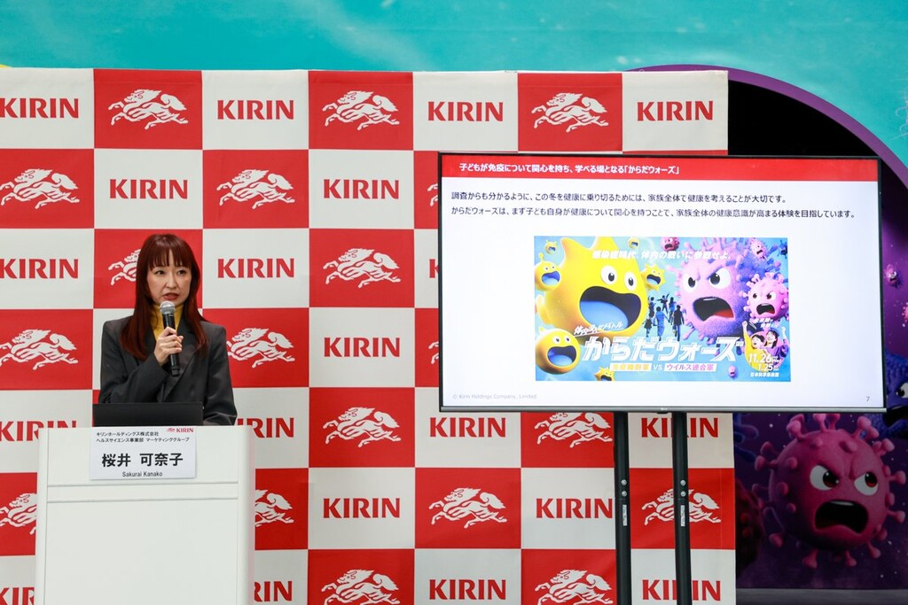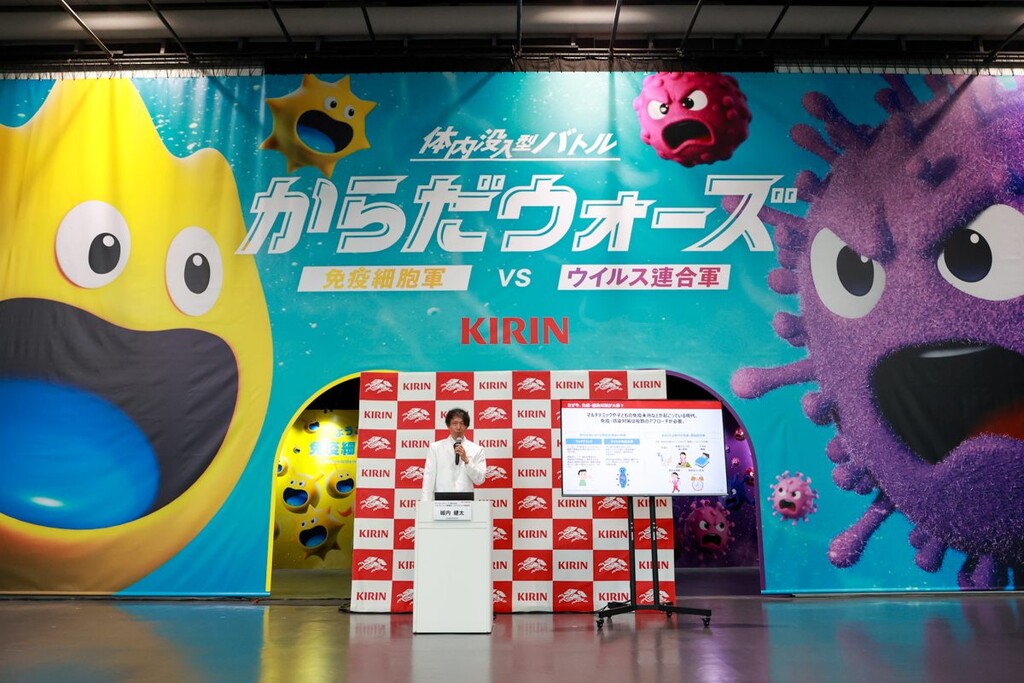 キリンホールディングス株式会社は、日本科学未来館にて、感染症と免疫を遊びながら学べる期間展示「体内没入型バトル からだウォーズ 免疫細胞軍 vs ウイルス連合軍」を2025年11月26日(水)〜2026年1月25日(日)に開催する。開催に先立ち、11月25日(火)にはメディア向け内覧会を実施した。オープニングイベントでは、キリンホールディングス ヘルスサイエンス事業部の桜井可奈子氏が登壇し、展示のテーマ、内容、開催背景について紹介。また、キリンの乳酸菌研究に関する解説を、同社ヘルスサイエンス事業部 ヘルスサイエンス研究所 主務の城内健太氏が行った。