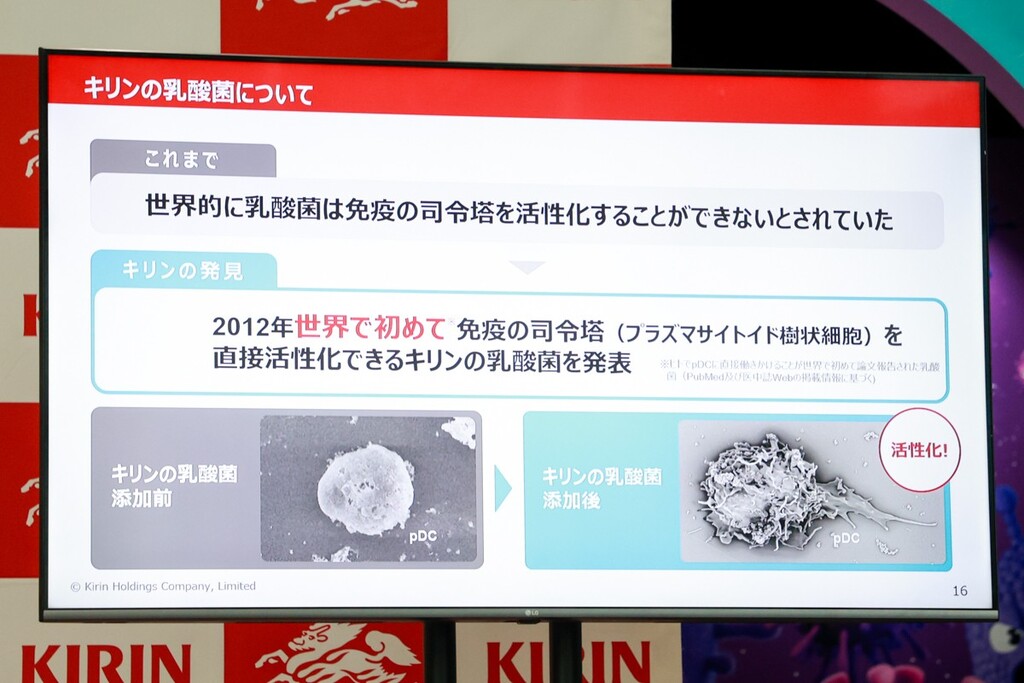 キリンの免疫研究については、同社 ヘルスサイエンス研究所の城内氏より、乳酸菌とPDCの研究成果が紹介された。