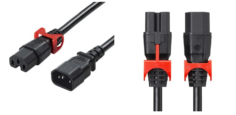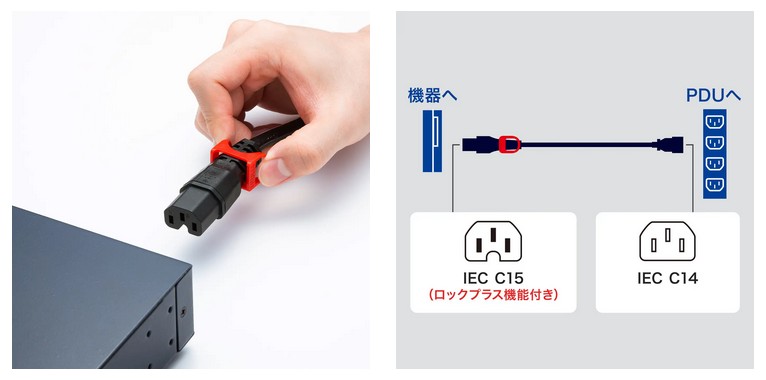 抜け防止のロック機構付きで、工具や追加部品無しで簡単に固定できる。データセンター・医療機器・放送設備など、電源ケーブルが抜けては困る場所での使用に最適だ。ソケット側(C15)の内部構造だけでロックでき、機器側の加工や特殊なインレットは不要。