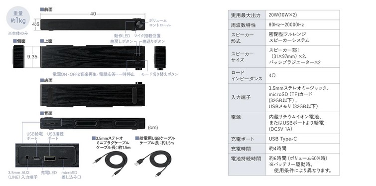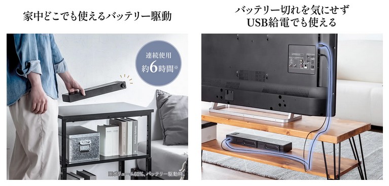本体にはリチウムイオン電池を内蔵し、最大約6時間の連続再生が可能。屋内利用はもちろん、部屋間の移動や一時的な配線レス環境でも活躍する。USB Type-Cで簡単に充電でき、給電しながらの使用もできる2WAY仕様で、使い勝手にも優れている。