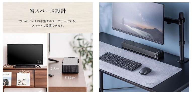 本体の高さはわずか46mm。24インチモニターから40インチテレビまで相性抜群のサイズ感で、画面下へすっきり収まり、視界を遮らない。奥行き・横幅もコンパクトなため、デスクやテレビ台にも自然にフィット。限られたスペースでも快適なオーディオ環境を作り出せる。