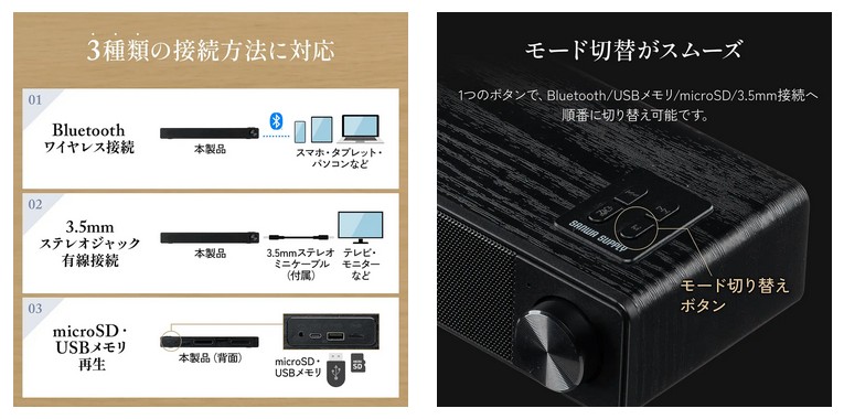 テレビは有線で、スマホ音楽はBluetoothで、さらにmicroSDやUSBメモリに保存したMP3も再生可能。シーンに応じて自由に使い分けられ、1台で家庭内の音楽環境を大幅に便利にする。スマートフォンを使わずに音楽が楽しめるため、リラックス時間のBGM用途にも最適だ。
