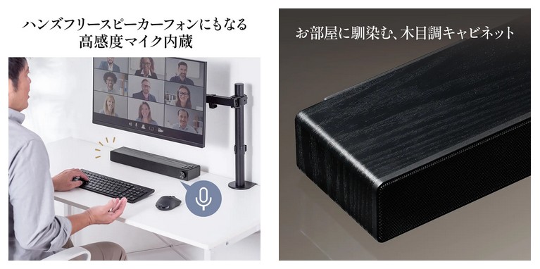 400-SP120は高感度マイクを搭載し、ハンズフリースピーカーフォンとしても使用できる。テレワークの通話やオンライン会議にも役立ち、音楽・映像以外の用途にも対応。木製キャビネットのシンプルなデザインは、インテリアにも馴染み、長く愛用できる落ち着いた雰囲気を演出する。