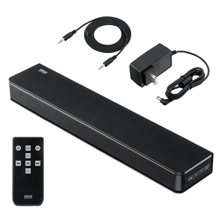 ACアダプタ駆動で安定した電力供給が可能、最大出力40Wの迫力あるサウンドを楽しめる。リモコンが付属しており、離れた場所からでも簡単に操作できて快適に使用できる。