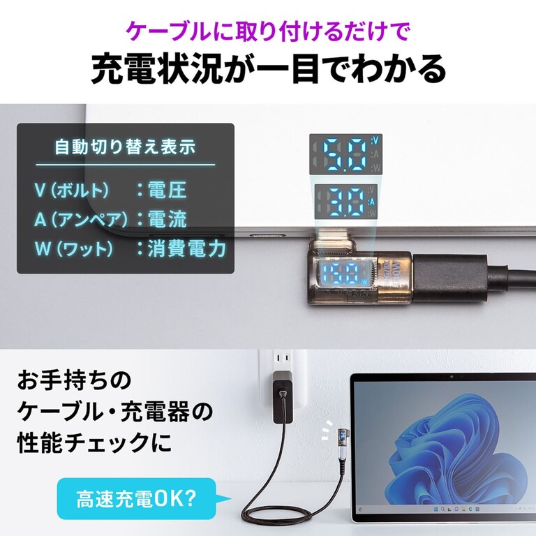 高速充電が本当にできているのか、ケーブルや充電器の性能が活きているのか――そんなモヤモヤを解消するのが電力表示機能だ。本製品はケーブルに挟むだけで、V(電圧)/A(電流)/W(消費電力)を順に自動表示。数字で確認できるから、充電トラブルの切り分けや性能チェックにも役立つ。