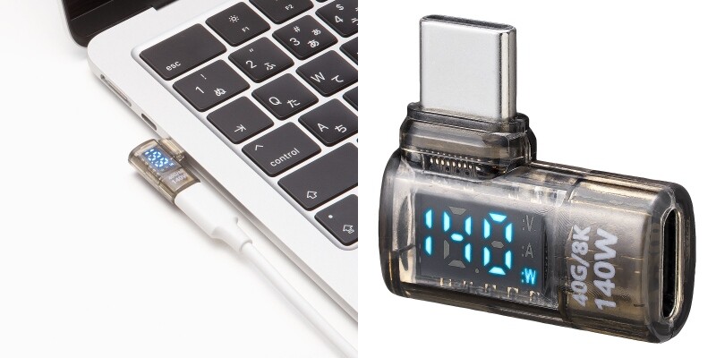 ゲームも作業も快適、PD140W×40Gbps×8Kに対応!電力表示付きL型Type-C変換アダプタ