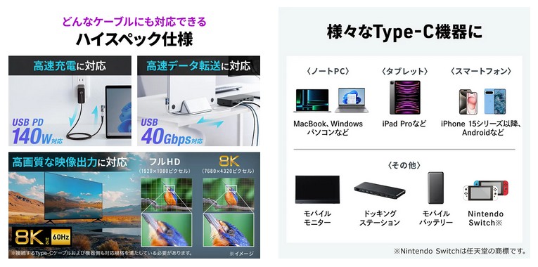 PD140W・USB40Gbps・8K/60Hzに対応した多機能USB-Cアダプタ「500-USB099」