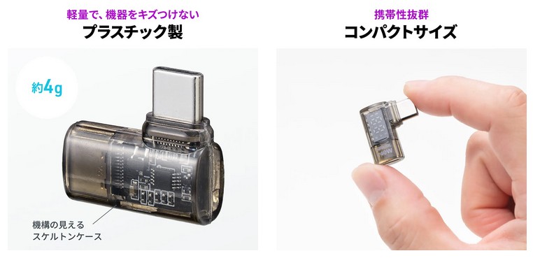 約4gの超軽量・コンパクト設計で、ポーチやガジェットケースに忍ばせても邪魔にならない。プラスチック製で機器を傷つけにくく、幅約3mmでスマホケース装着時にも対応。中の基板が見えるスケルトンデザインは、ガジェット好きの心をくすぐる“見せたくなる”デザインだ。
