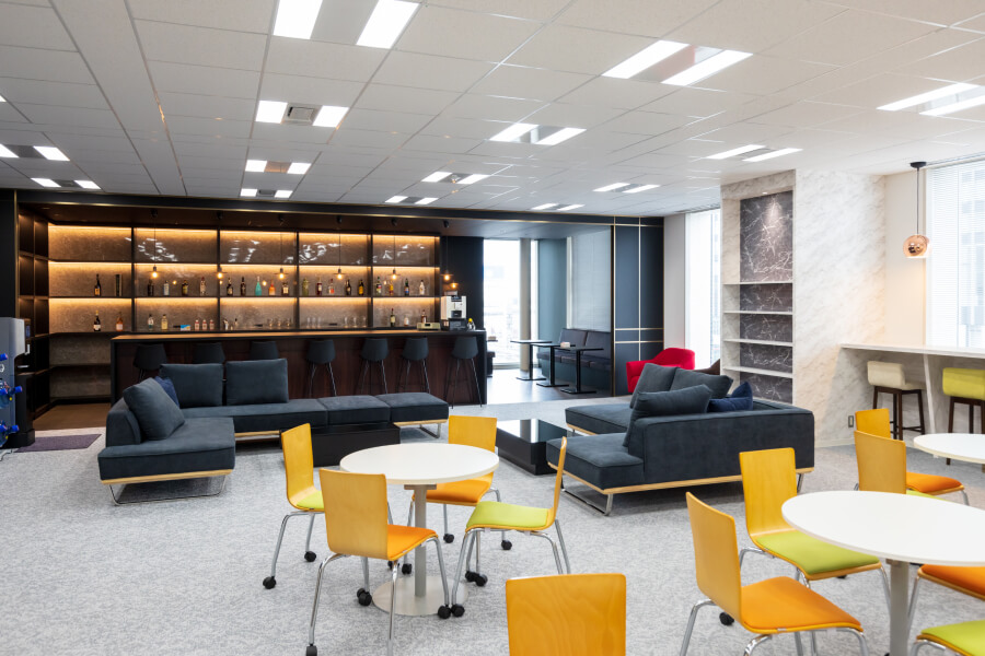昼間は打ち合わせやランチを通じた社員交流を促進し 、夜間はバーカウンターでリラックスしながら交流を深めることが可能だ。