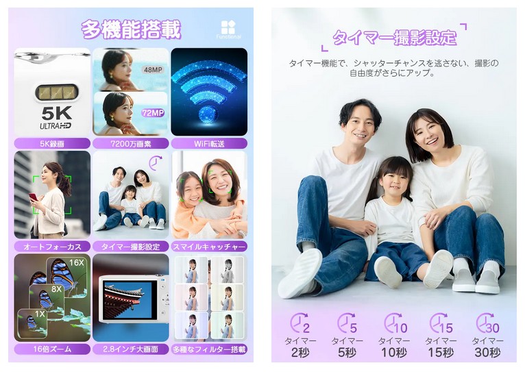デジカメには、2秒/5秒/10秒/15秒/30秒の多段階タイマー撮影機能を搭載。集合写真や家族写真でも、誰かがシャッターを押す必要がなく、みんなで安心して写り込むことができる。また、顔検出・笑顔検出・連続撮影・ビューティー機能・ホワイトバランス調整・日付/時間表示・自動オフ機能など、さまざまなシーンで役立つ機能を多数搭載している。