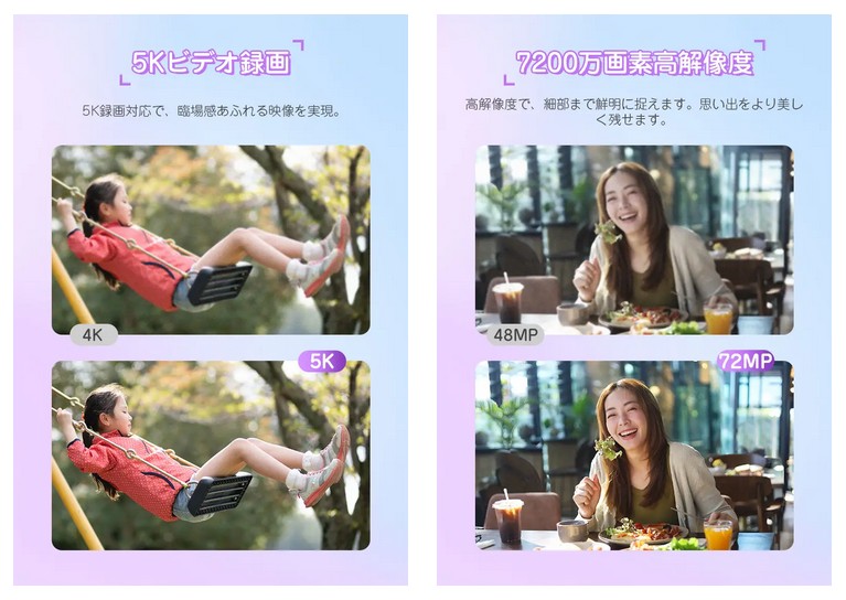 最新の高感度CMOSセンサーを搭載し、低照度環境でもノイズを抑えたクリアな撮影が可能だ。5K動画撮影では細部の質感まで鮮明に記録でき、7200万画素の高精細静止画は旅行やイベント、風景、人物などを一生ものの思い出として残せる高画質で撮影できる。