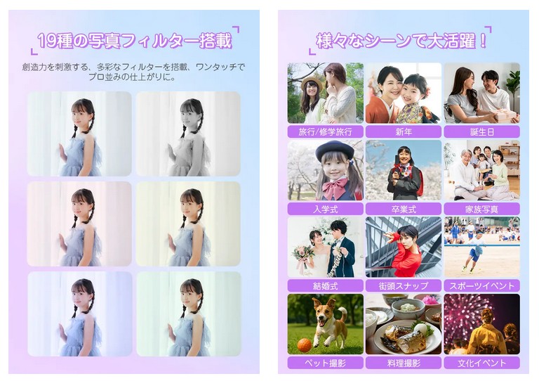 多彩な写真フィルタを標準搭載しており、運動会、卒業式、旅行、イベント、忘年会など、幅広いシーンで撮影の幅を広げる。初心者でもプロのような雰囲気ある写真を簡単に楽しめるのも特長だ。