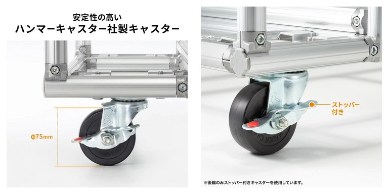 安定性が高い日本社製(ハンマーキャスター)製のゴム製φ75mmキャスターを採用しており、スムーズに走行できる。キャスターの位置を本体の内側に取り付けており、作業中に壁面や棚などにぶつかって邪魔にならない設計だ。また特注対応可能で、キャスターの材質や種類を変更することができる。