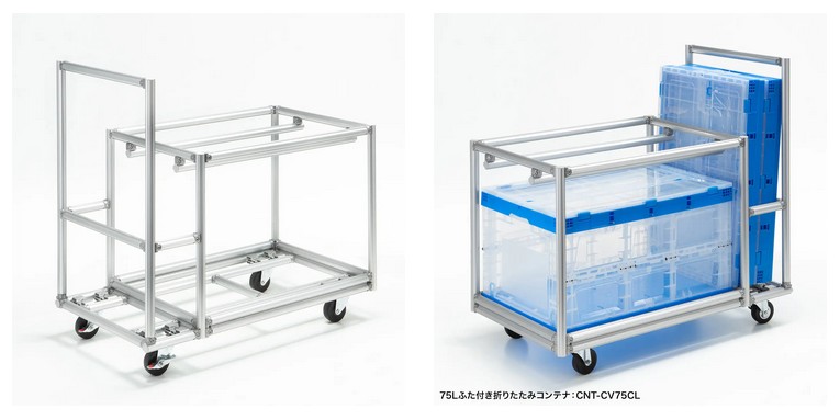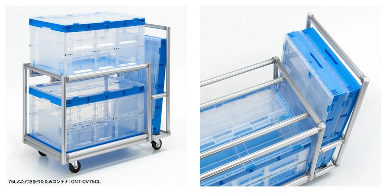 75L折りたたみコンテナを上下に積載でき、予備の2個も手前に折りたたんで収納可能なカート。コンテナ交換や追加のために倉庫や置き場に戻る手間が省けるので、作業の効率を上げることができる。また特注対応も可能で、載せるものや使用する場所に応じて希望のサイズやキャスターの変更をすることができる。