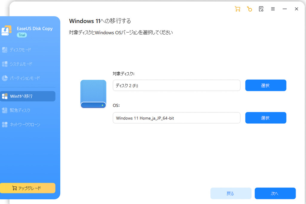 続いて、移行対象となるディスクとOSを選択する画面が表示される。OSはデフォルトの「Windows 11 Home_ja_JP_64-bit」で問題ない。