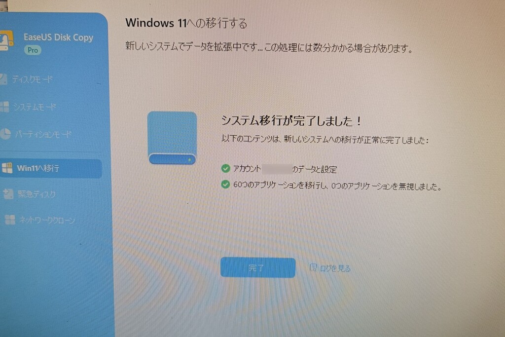デスクトップに移動すると、「EaseUS Disk Copy」が自動起動し、新しいデータ領域の拡張作業が再度実行される。完了後に「システム移行が完了しました!」と表示され、Windows 11が利用可能となる。