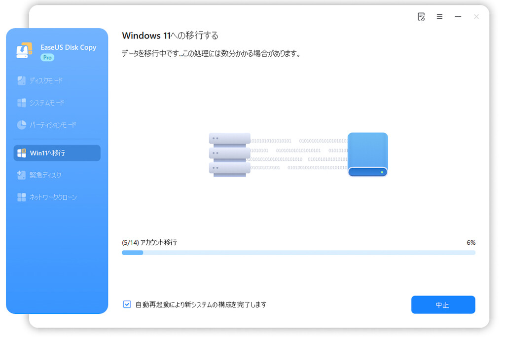 「自動再起動により新システムの構成を完了します」にチェックしている場合は、作業完了後にPCが自動再起動する。