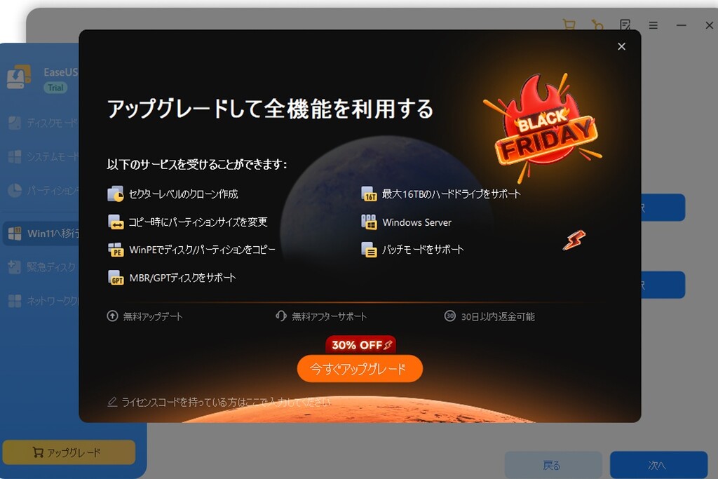 インストール後にソフトを起動し、「Win11へ移行」を選択する。