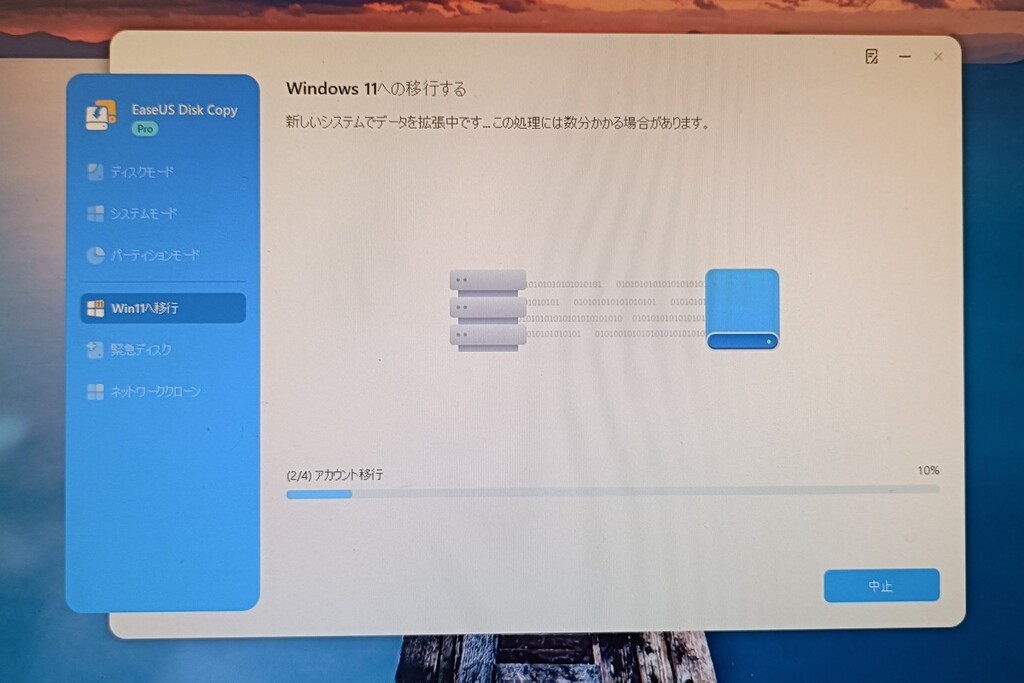 ライセンス入力後、「Win11へ移行」の処理が開始される。作業時間は元ディスクのデータ量に依存し、数時間かかる場合もある。ゲージの進みがゆっくりでも正常に処理が進んでいれば問題ないので、完了を待てばよい。