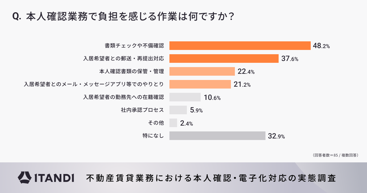 また、本人確認業務で負担を感じる作業について聞いたところ、約半数となる48.2%が「書類チェックや不備確認」について負担を感じる、さらに3分の1以上となる37.6%が「入居希望者との郵送・再提出対応」も負担に感じると回答。現状行なっている本人業務において、手作業が発生するものに対して負担を感じていることがわかった。