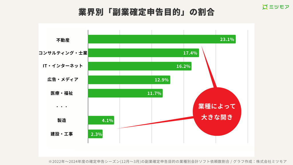 〇副業確定申告を行う人の本業の割合を業界別に見ると、不動産業界が23.1%で最も高い。一方、建設・工事業界は2.3%、製造業は4.1%と業界ごとの差が明確に