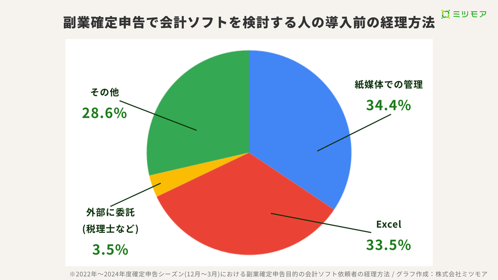 会計ソフトを検討している副業確定申告者の現在の経理方法を見ると、「紙媒体での管理」が34.4%、「Excel・Googleスプレッドシート」が33.5%と、合計約7割がアナログな方法で経理を行っていることが分かった。一方、「外部に委託(税理士など)」はわずか3.5%にとどまり、ほとんどの人が自力で経理に取り組んでいる実態が明らかになった。