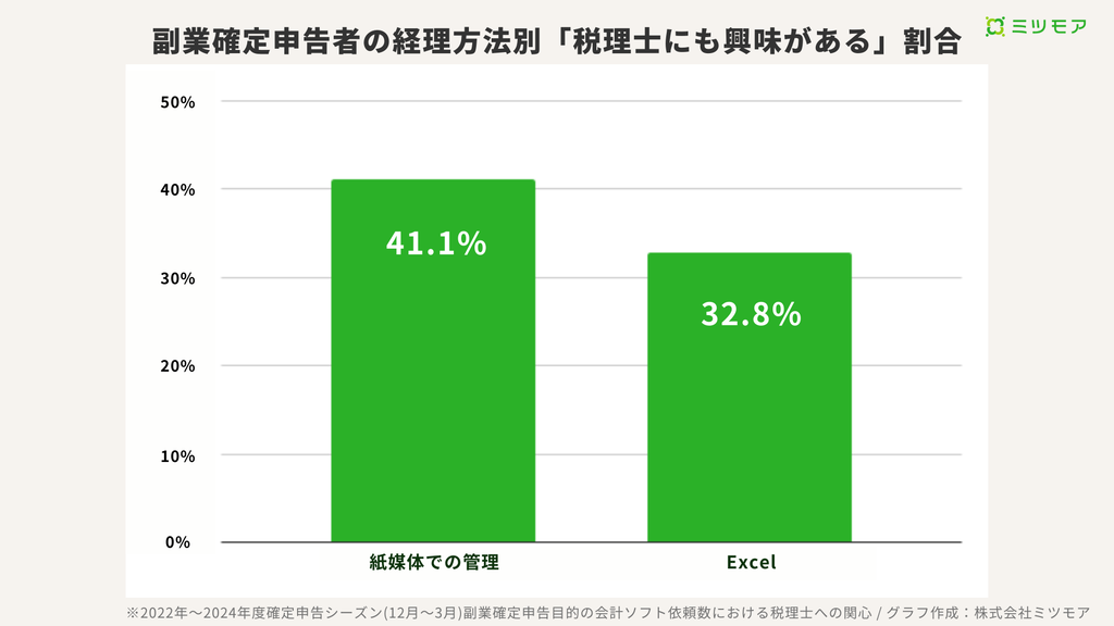 経理方法別に「税理士の代行サービスにも興味がある」と回答した割合を見ると、紙媒体で管理している人は41.1%、Excel・スプレッドシートで管理している人は32.8%と、約8ポイントの差があった。紙で管理している人ほど、デジタル化への不安も相まって、専門家に頼りたいと考える傾向がうかがえる。