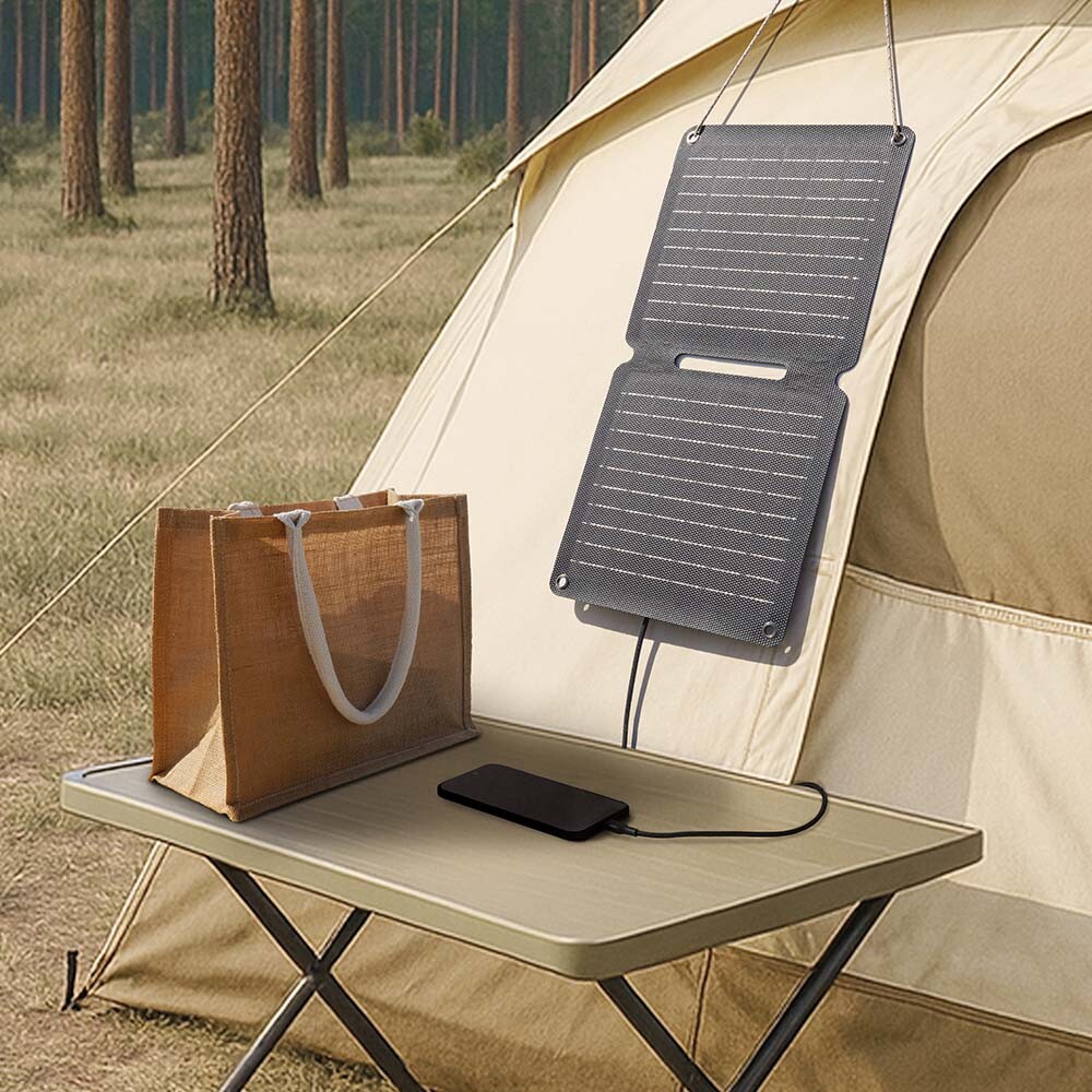 太陽の光を電力に変えて、スマートフォンなどのUSB機器を充電できるポータブルソーラーパネル充電器。アウトドアや災害時など電源が無い場所でも太陽光があれば使用できる。