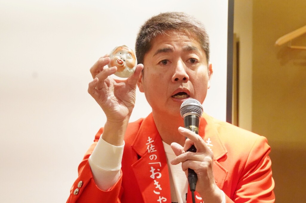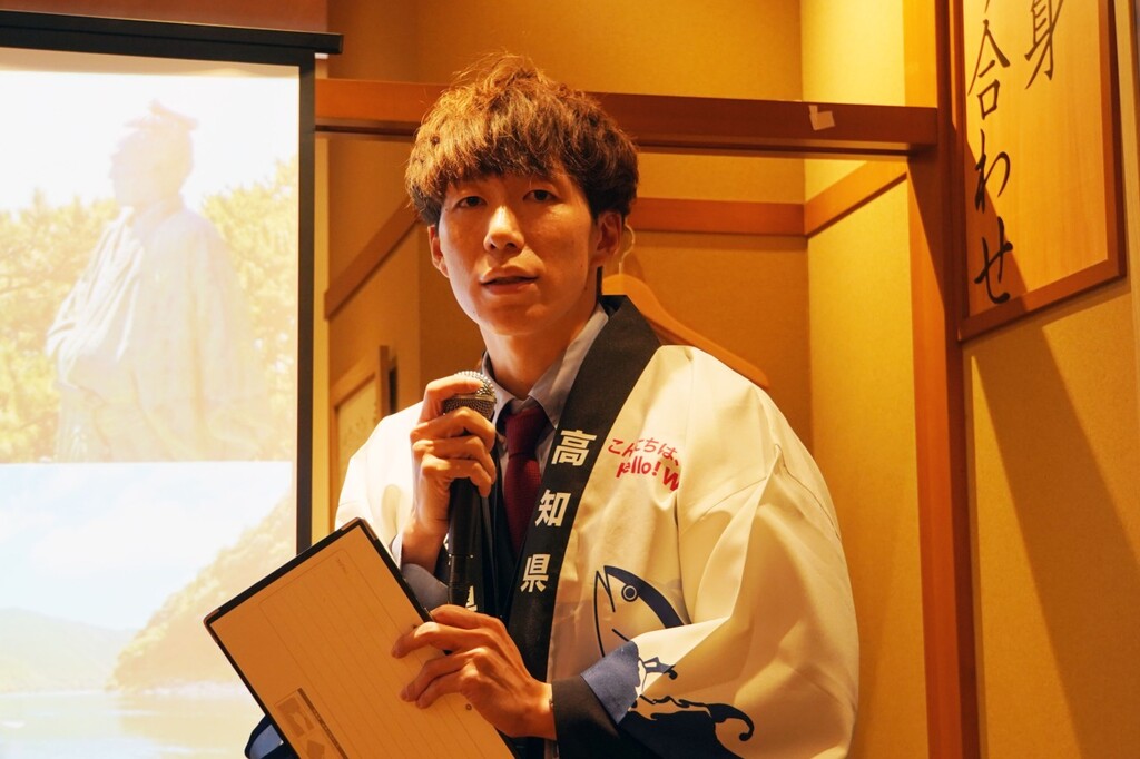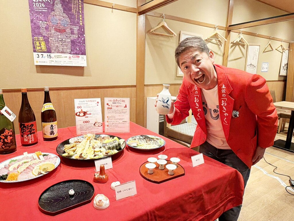 メディア向け体験取材会では、土佐の「おきゃく」2026実行委員長「土佐かつお」さんが登場。「可杯(べくはい)」「菊の花」を実際に体験してみせた。