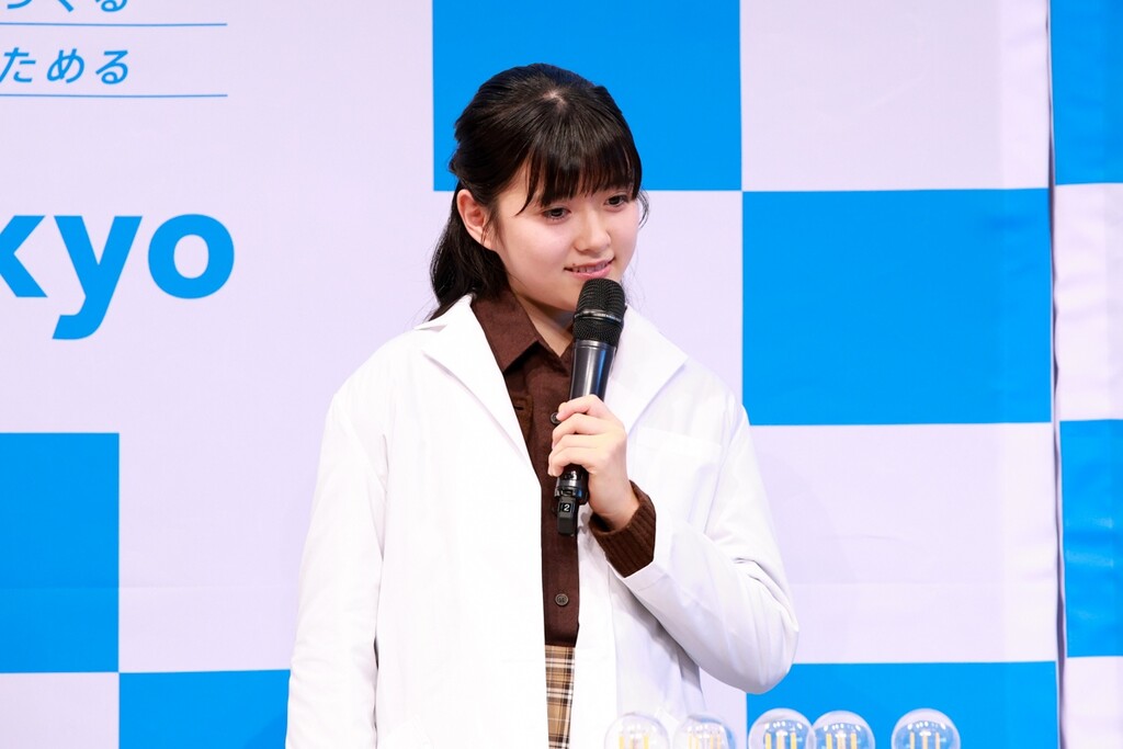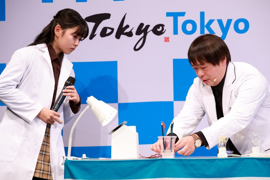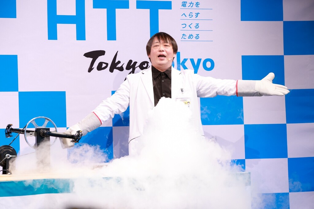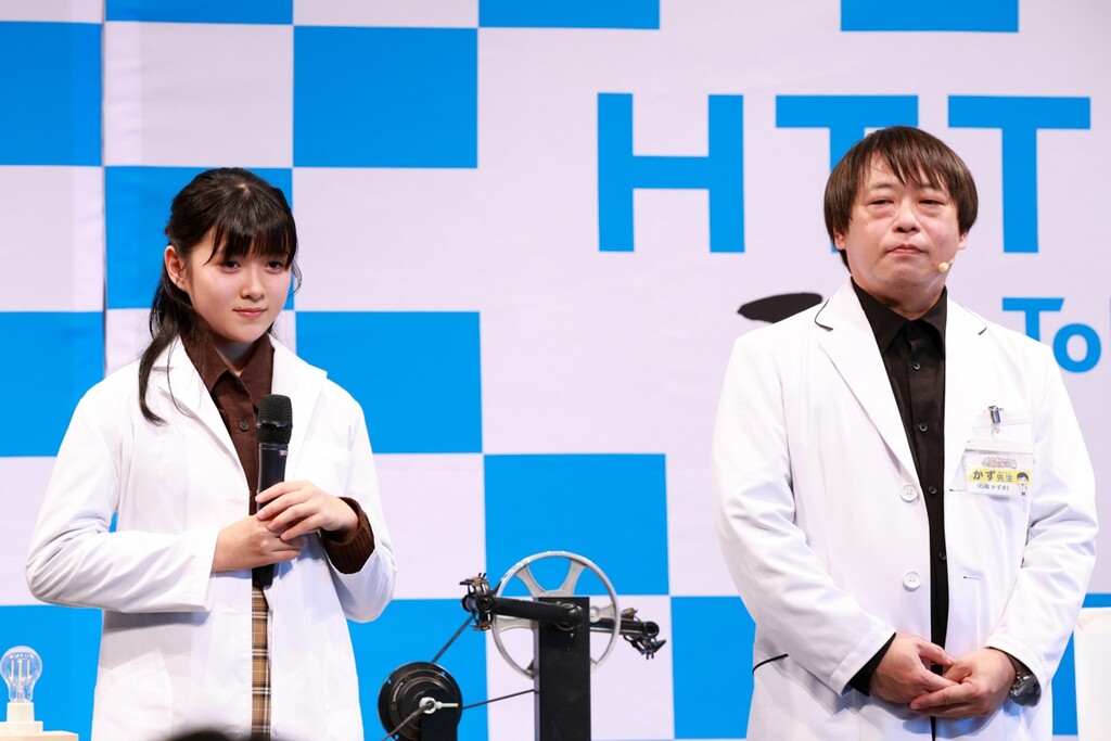 いよいよメインイベントとなるサイエンスショーがスタート。進行役のかず先生は「今日はHTTを“目で見て、体で感じて”もらいます」と宣言した。堀越さんは白衣姿で再登場し、ステージ上の実験道具を見渡しながら、「こんなにたくさんの実験を人前でするのは初めてで、ちょっとドキドキします」と率直な気持ちを明かした。