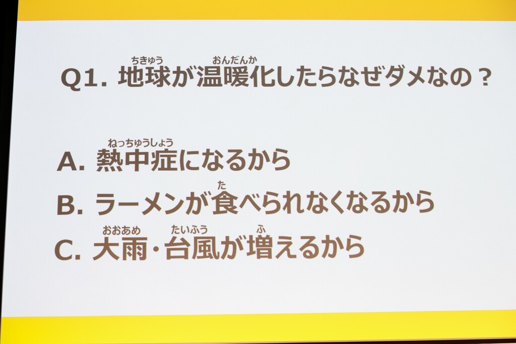 「なぜ地球温暖化はダメなのか?」というクイズでは、「熱中症になるから」「ラーメンが食べられなくなるから」「大雨や台風が増えるから」といった一見ユニークな選択肢が並ぶ。堀越さんは思わず笑いながらも、「ラーメンがなくなるのはちょっと困ります……」とコメントしつつ、真剣に考え込む様子を見せた。