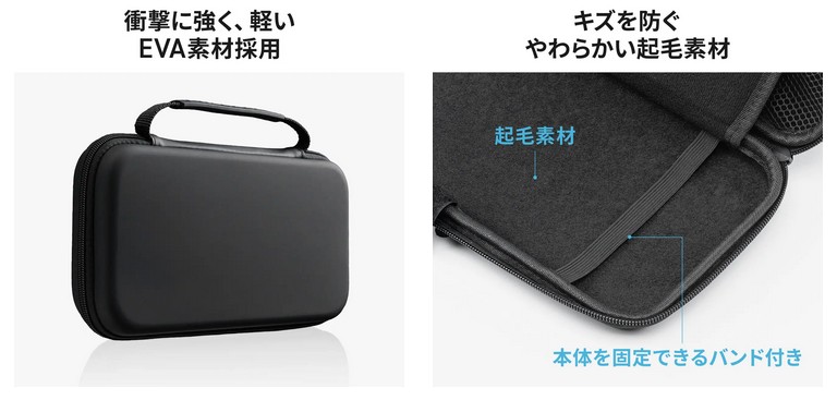 EVA素材を採用したセミハードケースは、外部からの衝撃をしっかり吸収。カバンの中で押しつぶされる心配がなく、移動時も安心だ。内側には柔らかな起毛素材を使用し、本体への擦り傷を防止。さらに固定用バンドを備えているため、ケース内でのズレを防ぎ、常に安定した状態で保管できる。