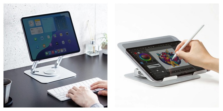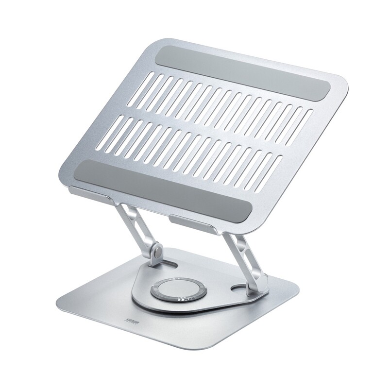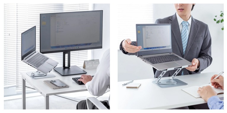 360°自由に回転できる台座を搭載し、スタンドの向きをスムーズに調整できる。他の人に画面を共有したり、メインモニターの横にノートパソコンを設置する際に便利だ。