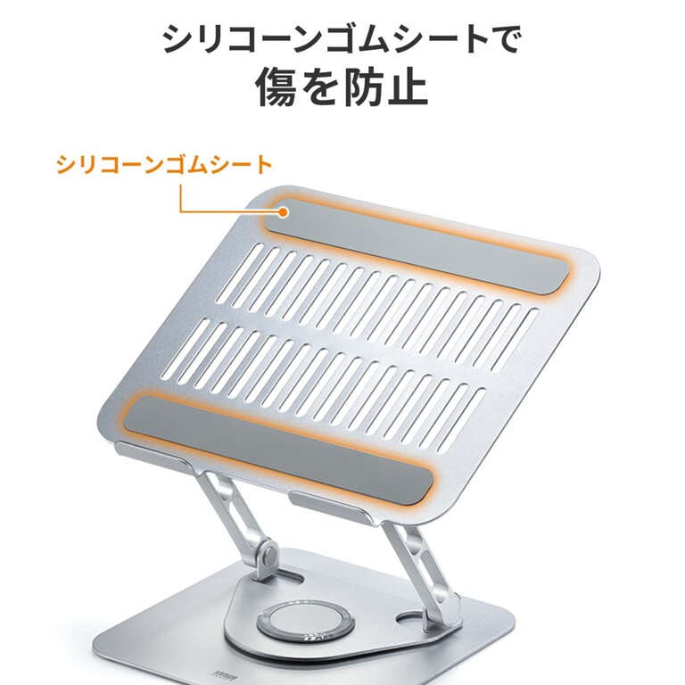 ノートパソコンと接する部分はシリコーンゴムシートにより、ノートパソコンに傷が付くのを防ぐ。