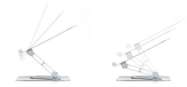 ヒンジ構造により無段階で自由に角度と高さを調整することができる。