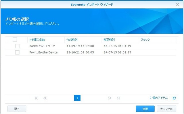 インポートしたいノートにチェックを入れ「適用」をクリックするとインポートが始まる