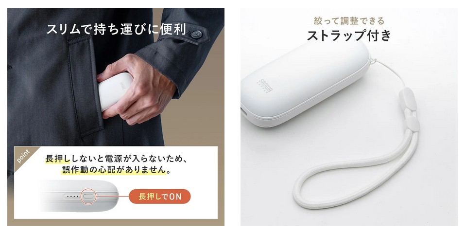 本体は細くコンパクトなスリム設計で、ポケットや小さめのポーチにもスッと収まるサイズ感。付属のストラップでバッグに引っ掛けたり、携帯時に落下を防止したりと、使う場所を選ばない。
