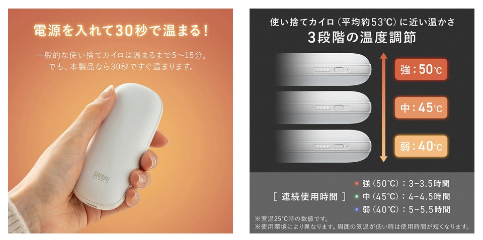 サンワサプライ株式会社が運営している直販サイト『サンワダイレクト』は、電源を入れてたった30秒で温まり、繰り返し使えるUSB-C充電式カイロ「400-TOY052W」を発売した。