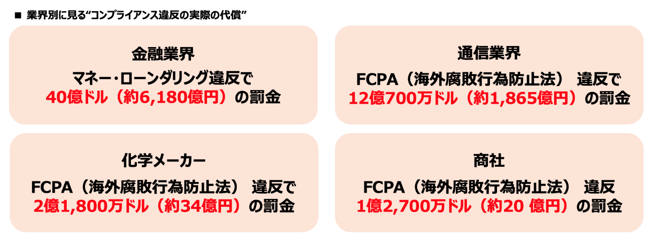 世界的に見ても、金融、通信、製造業などあらゆる業界でコンプライアンス問題が相次いでいます。その影響はもはや「一部署の不正」にとどまらず、企業全体の経営判断や社会的信頼を揺るがすレベルにまで拡大しています。