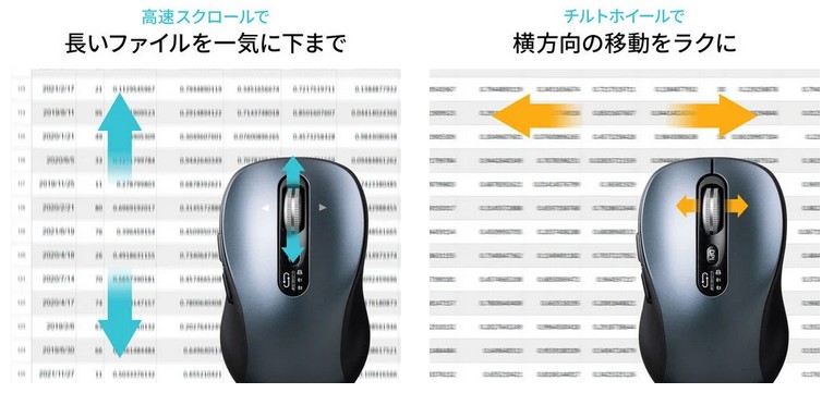 一気に下まで移動できる高速スクロール機能を搭載し、縦に長いWebサイトや資料の閲覧もストレスがない。さらに、ホイールを左右に倒すことで横スクロールができるチルト機能も備えている。Excelなどの表計算ソフトで横に長いデータを扱う際にも、マウスを動かすことなくスムーズな画面操作が可能だ。