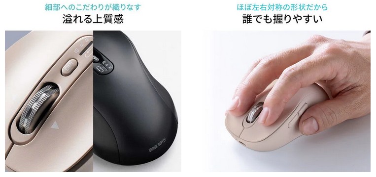 センサーには光沢のある机の上でも正確に反応するBlueLEDを採用した。カーソル速度は用途に合わせて4段階(1000〜3200カウント)に切り替えられ、繊細な作業から素早い操作まで対応する。外観は落ち着いたベージュにゴールドのアクセントを施した上品な仕上げで、マットな質感がデスク周りを華やかに彩る。