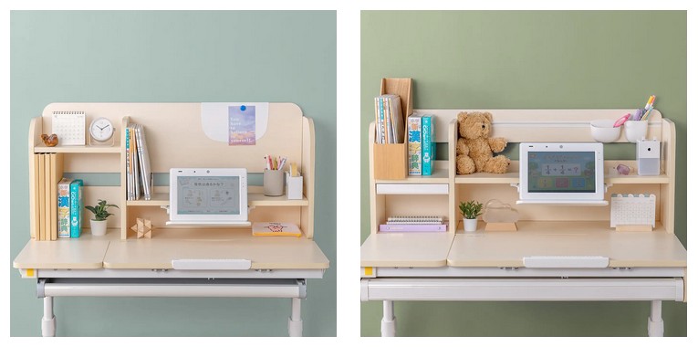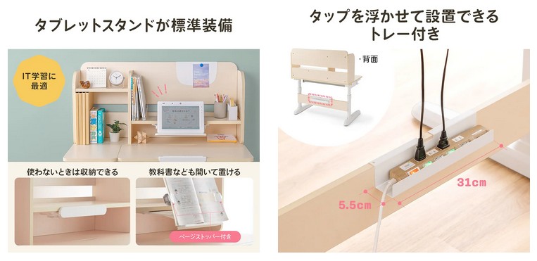 タブレットを目線の高さに設置できる専用ホルダーや、ケーブルの散らかりを防ぐタップ受けなど、学習環境を整える機能を充実させた。子どもの学びを快適にサポートし、デジタル学習にも対応した、現代の学習スタイルに適した設計だ。