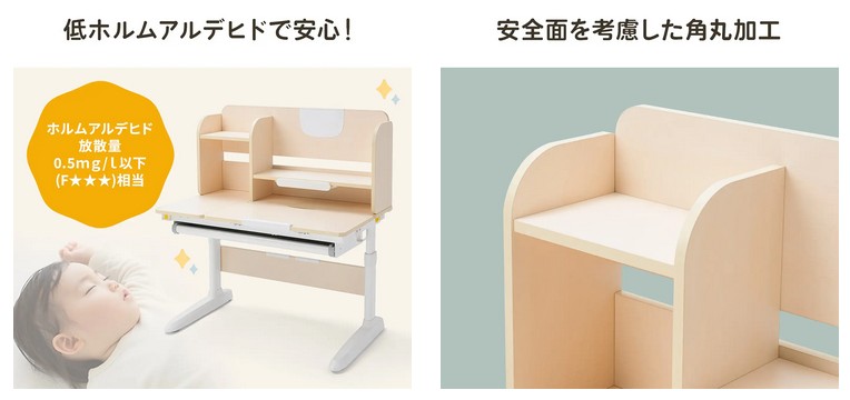 天板には反射防止加工を施し、耐摩耗・耐傷性にも優れた仕上げを採用。水性ペンの落書きや汚れも簡単に拭き取れる。木材にはF☆☆☆相当の低ホルムアルデヒド素材を使用し、健康面にも配慮。お子さまが毎日触れるものだからこそ、細部まで安心にこだわった。