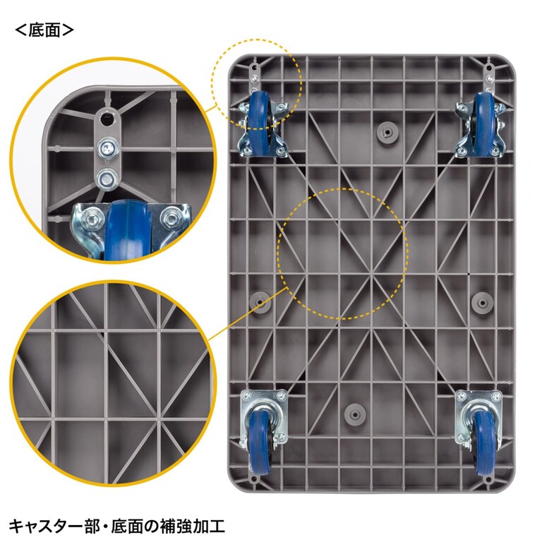 キャスター部・底面の補強加工により、高耐荷重を実現している。