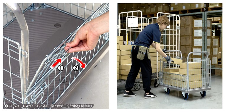 かごの四面のうち一面は、網のストッパーを操作することで2段階の高さで開閉できる。全体を開くだけでなく半分の高さでも開閉できるため、荷物の出し入れがスムーズに行える。