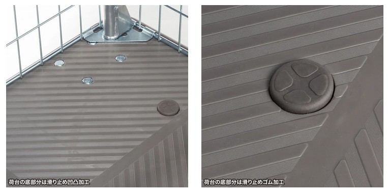 荷台の底部分にはすべり止めの凹凸加工が施されている。底部分の4か所にすべり止めのゴムも付いているので、荷物を安定して運べる。