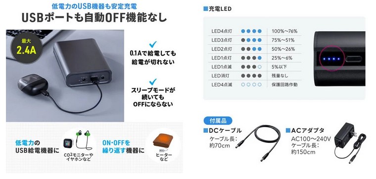 本製品はUSB出力(最大2.4A)も搭載し、スマートフォンやタブレットへの充電にも対応する。自動判別機能によりiOS/Androidに合わせた最適な給電が可能で、日常の充電用途にも使いやすい設計です。4つのLEDで残量確認もしやすく、突然の電池切れを回避しり。