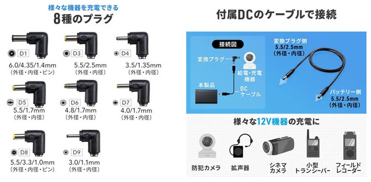 「プラグ径が違って接続できない…」そんな悩みを減らすために、異なるプラグ径に対応する変換プラグを8種類付属する。対応できる機器の幅が広がり、購入後すぐに使えるのも嬉しいポイントです。さらにDCケーブルも付属しているため、余計な準備なしで導入できる。