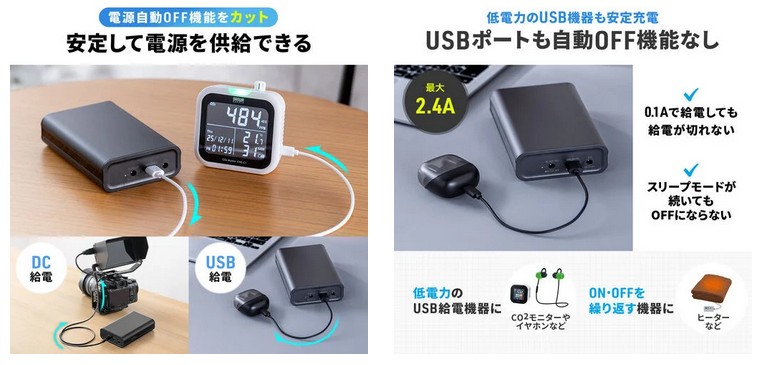 低電力でも自動OFFせず、DC12V機器へ安定給電!リン酸鉄バッテリーを搭載したモバイルバッテリー